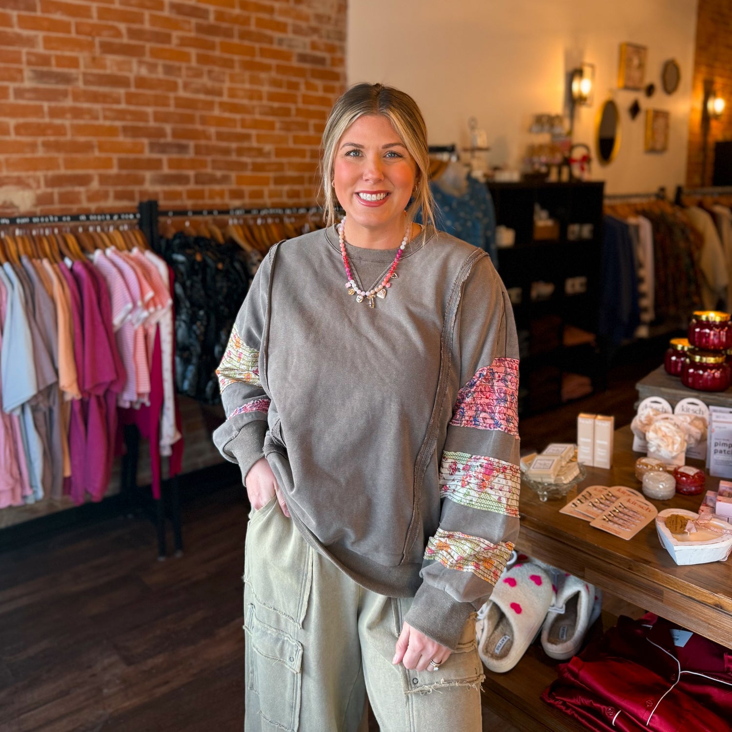 Easel ash mineral printed top. Adorable band detail with bubble sleeve. A great transitional piece!