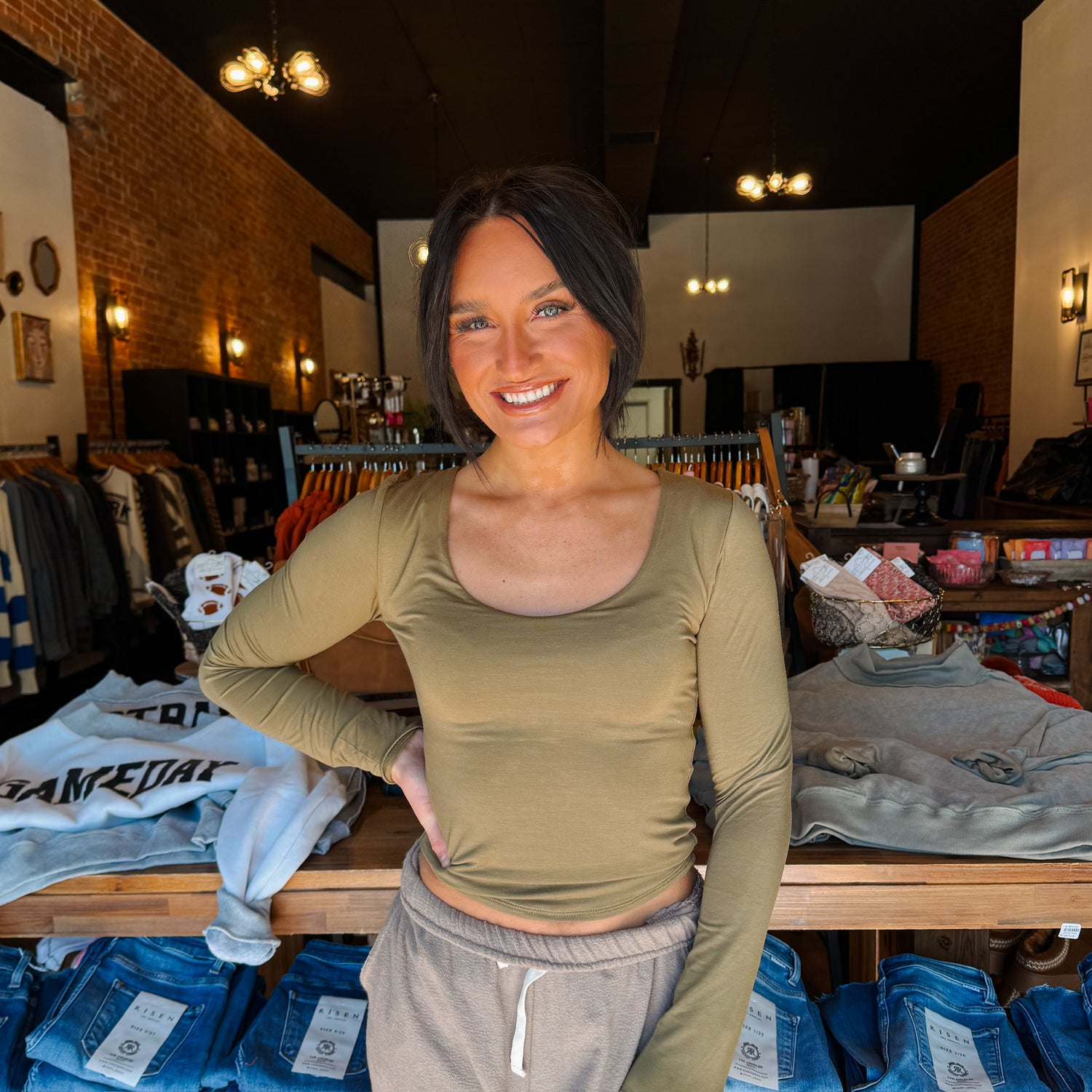 Buttery soft basic long sleeve top in the color martini olive. Slim fit with stretch. Double lined.