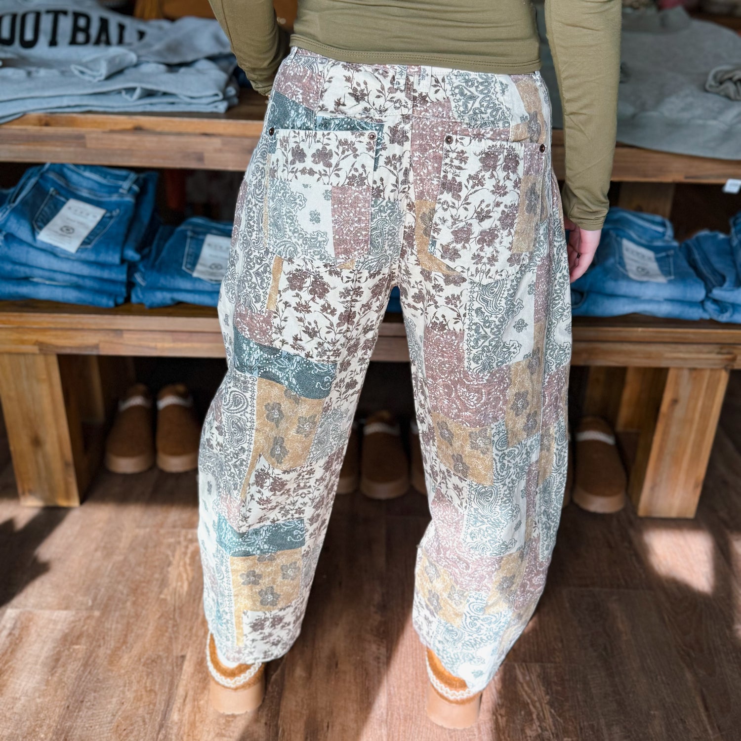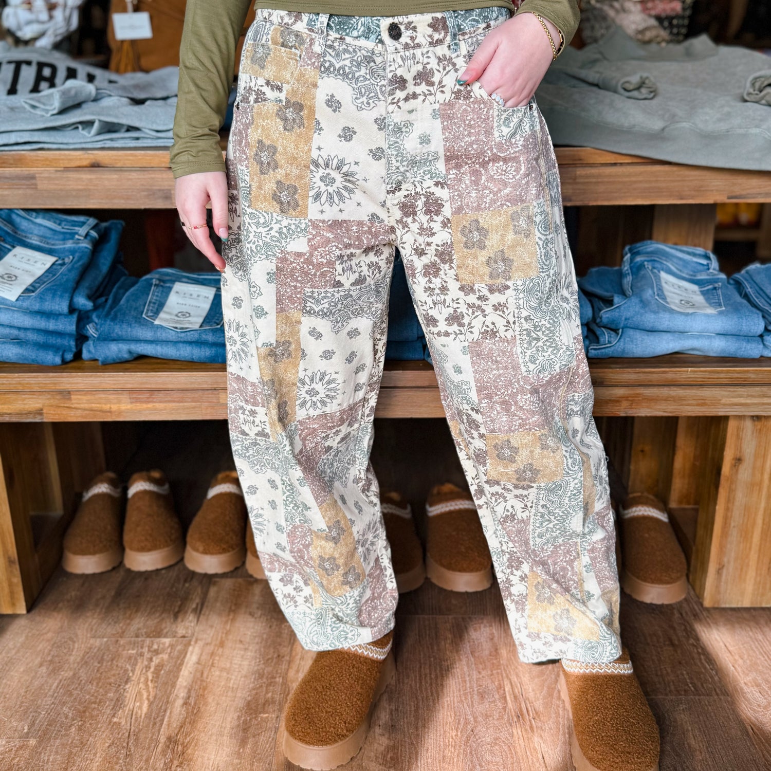 THE CUTEST PANT EVER. Urban Daisy boho patchwork wide leg denim pant. Size S-L available. Model is wearing a size small. Fit TTS.