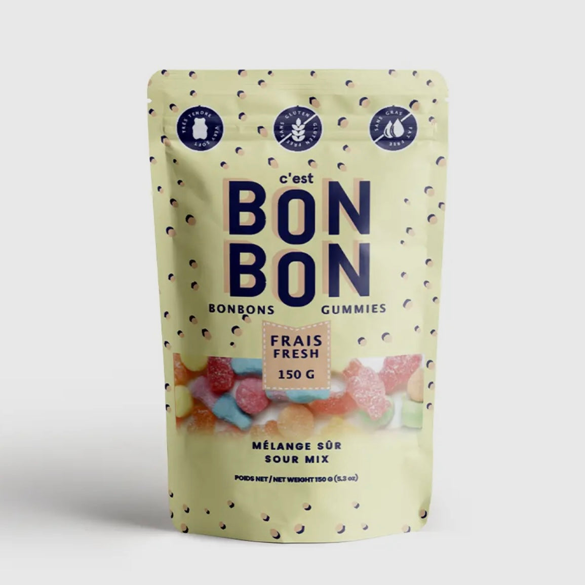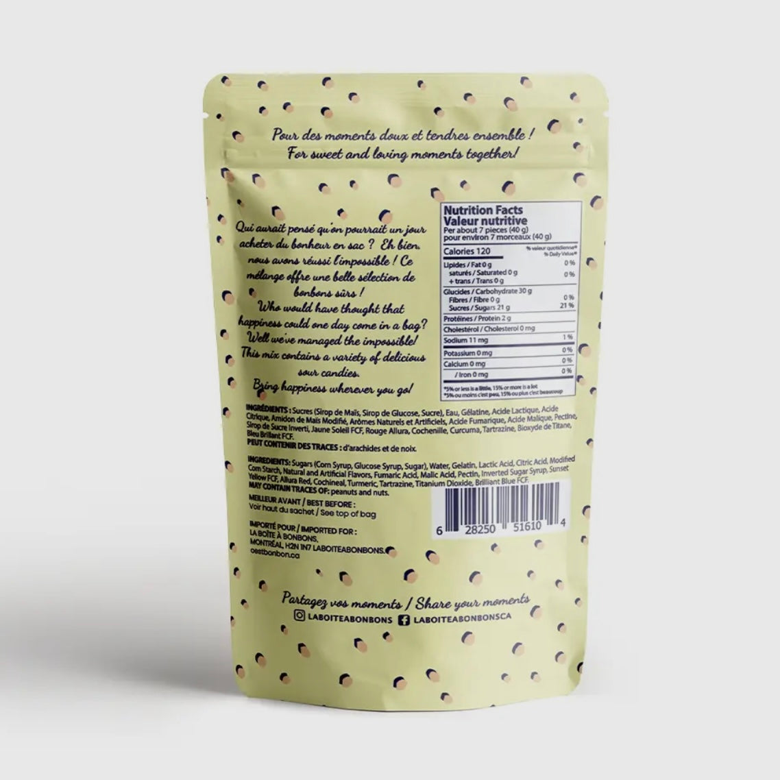 Who would have thought that one day you could buy happiness in a bag? Well, we've done the impossible! This mix offers a nice selection of sour candies! It is the alter-ego of the sweet mix, and still as popular and as good as ever! It's made up of our customers' favorite candies: little bears, bottles, and rings of all kinds, shapes and flavors.