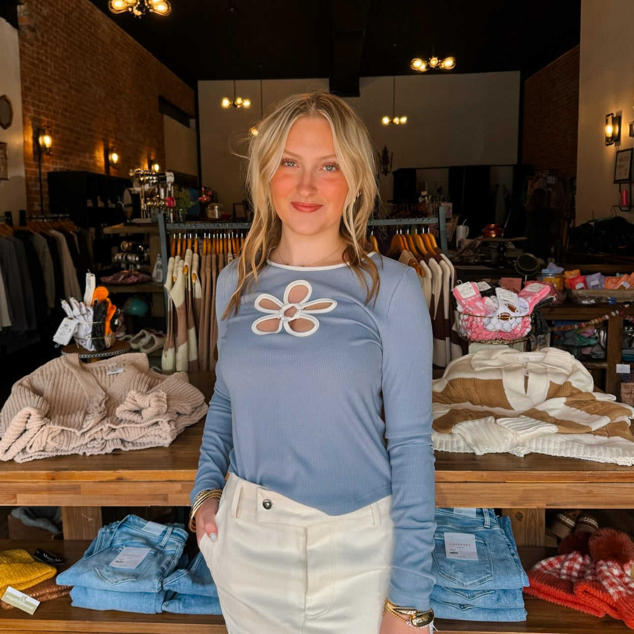 Basic ribbed jersey long sleeve top with contrast binding flower cut out detail.