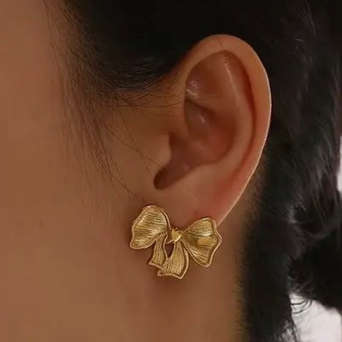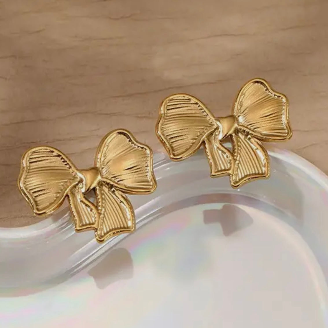 Stripe textured ribbon stud earrings feature charming bow designs meticulously crafted with high-quality stainless steel with an 18K gold finish, ensuring they remain tarnish-free and lustrous over time.
