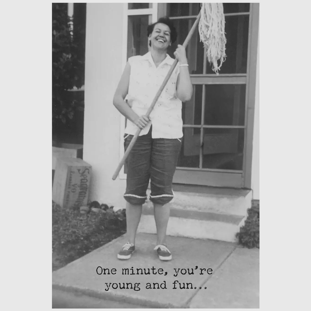 A greeting card from the Trash Talk By Annie Collection displaying a vintage black and white photograph complemented with a humorous sentiment. Greeting card features a funny sentiment on the outside and sentiment on the inside with space to add a personalized message.
