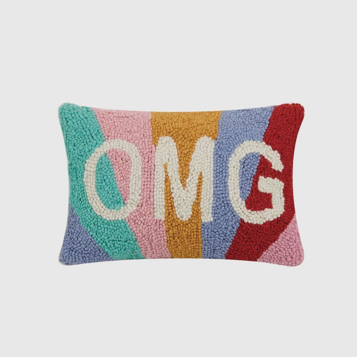 OMG hook throw pillow measuring 12”x8”