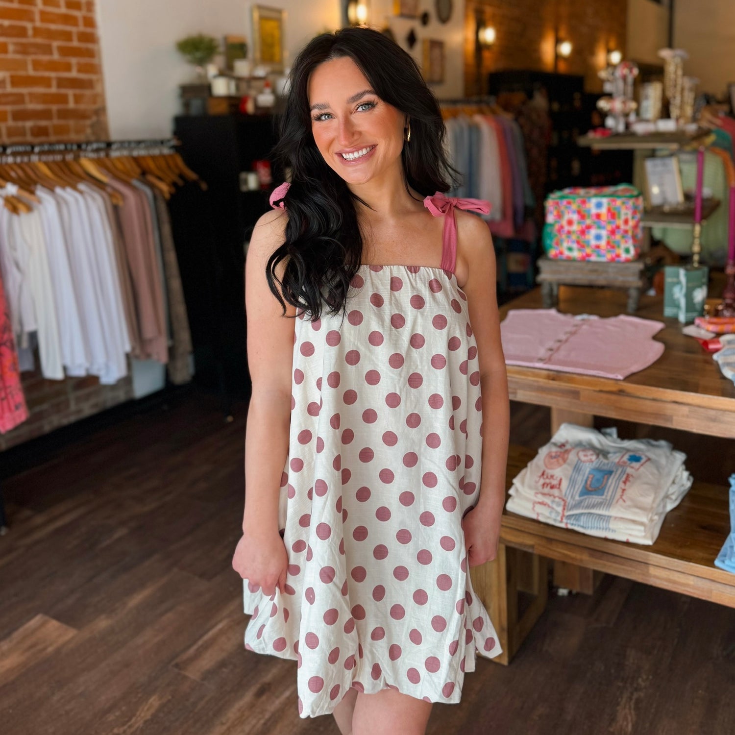 Dusty pink polka dot mini tie dress. Such a cute dress for any occasion!