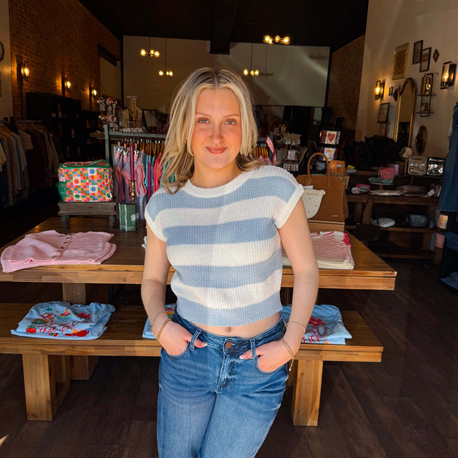 This top is crafted from a soft, breathable yarn with a distinct ribbed knit texture, offering comfort and dimension. It features a classic crew neckline, modern capped sleeves, and bold horizontal stripes. With a cropped, fitted silhouette, it pairs perfectly with high-waisted denim for a relaxed, yet chic, vibe.