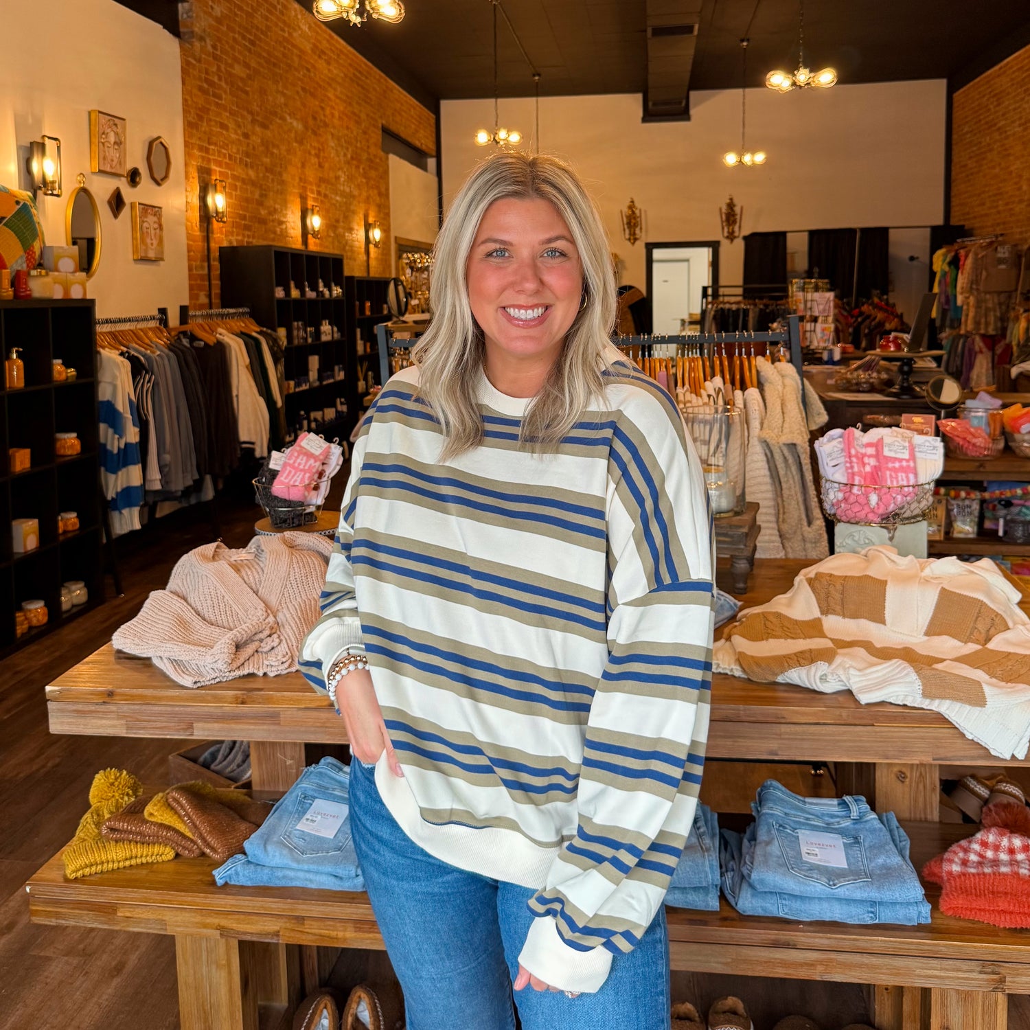 BUCKETLIST striped terry oversized crewneck in olive & navy.