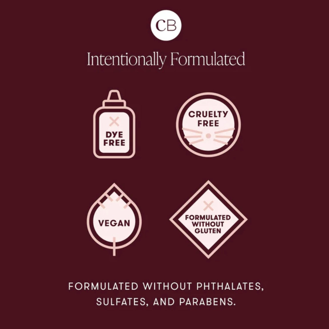 Vegan formula. Cruelty-free. Formulated without gluten, parabens, sulfates, and phthalates. No synthetic color.