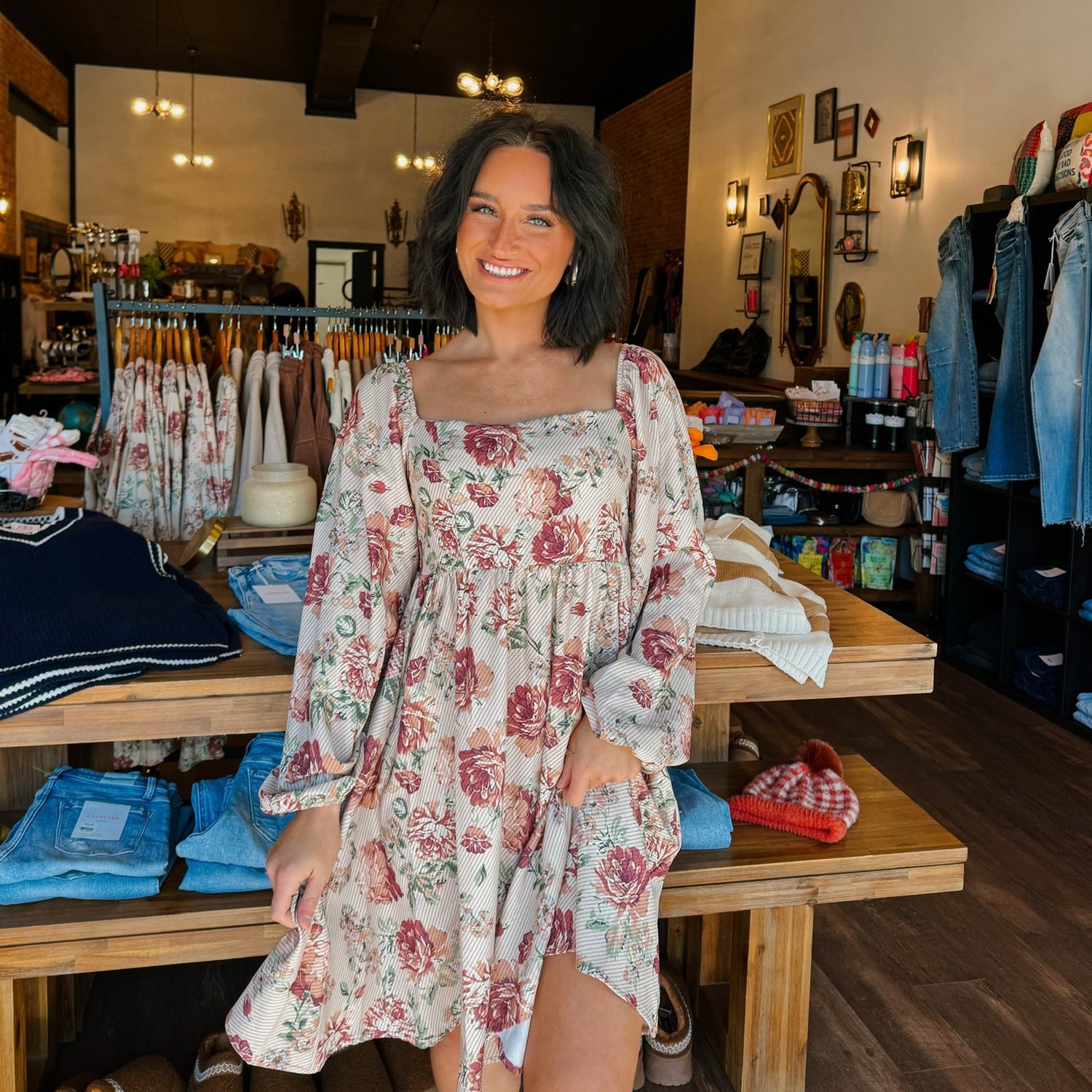 Vintage Floral Print Long Sleeve Babydoll Dress
