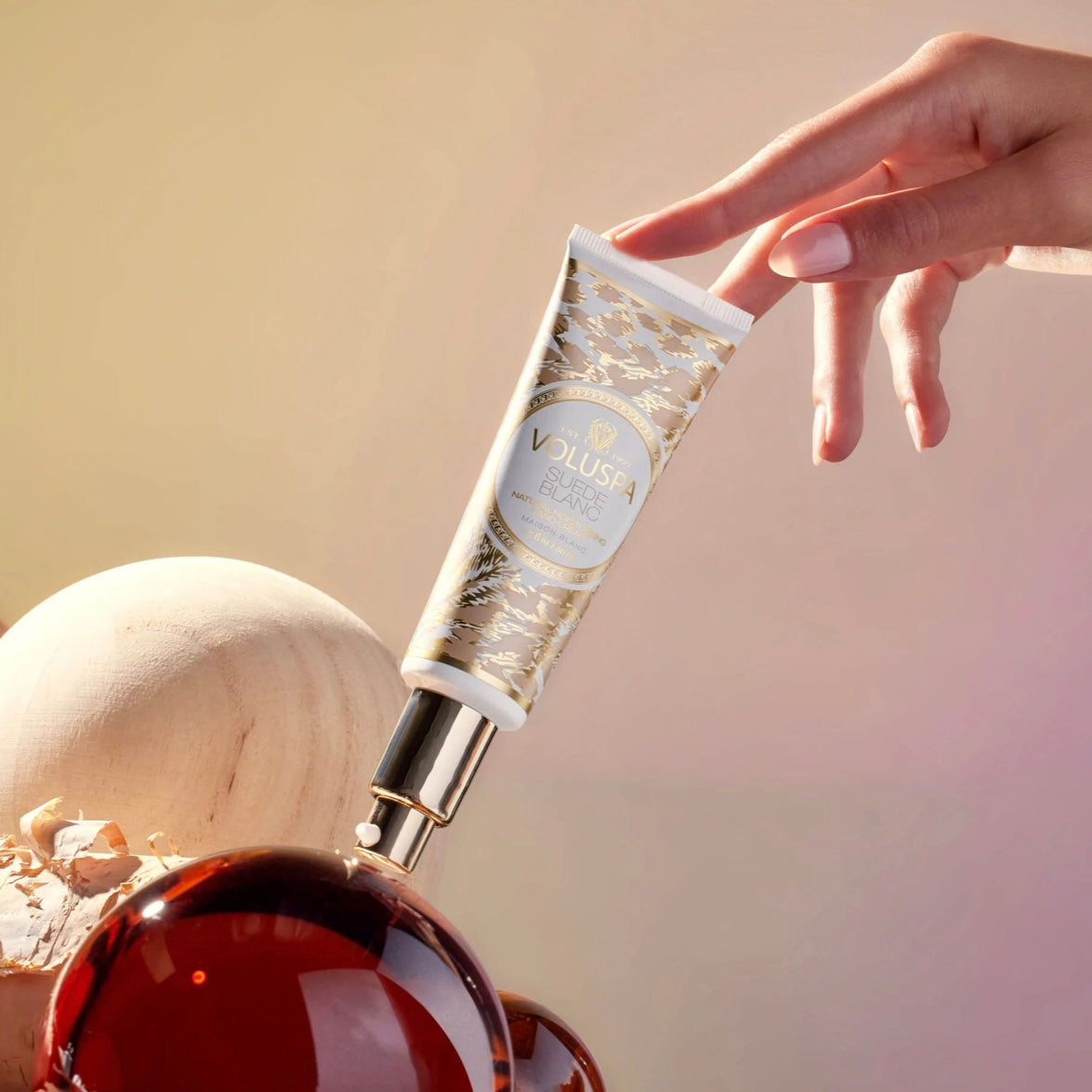Voluspa’s Moisturizing Hand Cream was specifically designed with an applicator pump to easily moisturize and revive your senses on the go, while maintaining its luxurious appearance. Each hand cream is packaged in a decorative box, as one always wants to gift their favorite personal care item.