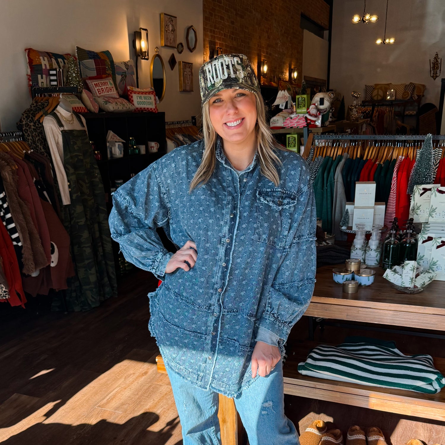 Easel textured washed denim button down top. Runs oversized.